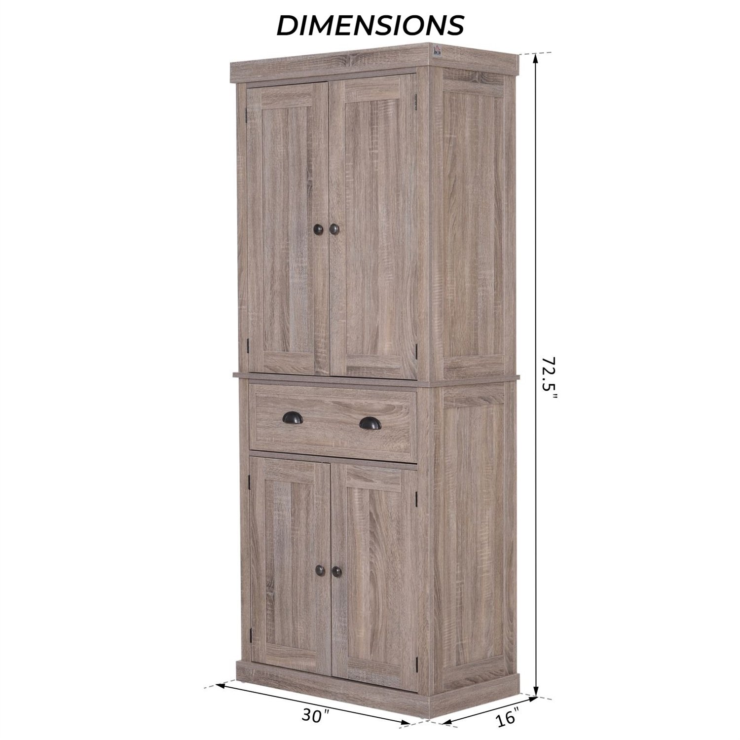 This elegant FarmHome 6ft Kitchen / Bathroom Storage Pantry Drawer Cabinet Wood Grain becomes a functional centerpiece in any room, adding charm along with ample storage and display space. The kitchen pantry features a single center drawer with both the upper and lower doors opening to 1 fixed and 2 fully adjustable shelves, which allows for flexible storage space that fits your individual needs. The kitchen pantry features a single center drawer with both the upper and lower doors opening to 1 fixed and 2 fully adjustable shelves, which allows for flexible storage space that fits your individual needs. Constructed from engineered wood with a reinforced backboard and wall attachments for added stability and safety. he vertical kitchen cabinet takes up little floor space that measures 30 inches W x 16 inches D x 72.5 inches H, with an overall 220lbs weight capacity.