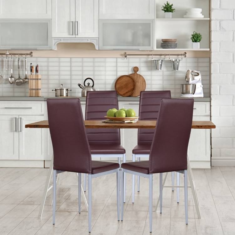 • Set of 4 Modern High Back Brown PVC Leather Dining Chairs with Metal Legs